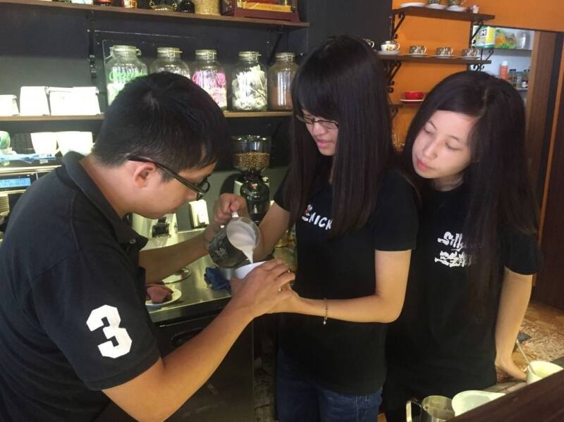 金门县政府主办,金门县儿童及少年福利服务中心承办的"特调拉花营",学员在店家老板胡凌雄(左)指导下,学做咖啡拉花。中央社