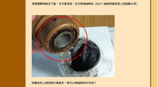 为了不用清洁内部,网络上有人分享可以直接套塑胶袋, 后来我发现这样作会有静电的问题,磨玩后咖啡粉会吸付 在上方,而且咖啡粉会卡在塑胶袋里面非常难倒,如下图: