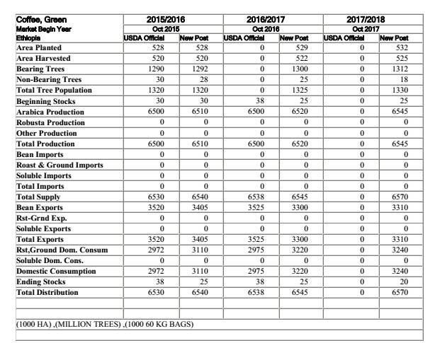 USDA估计,由于出口量少于预期,2016/17年的出口减少到330万袋。埃塞俄比亚政府数据, 16年10月-17年3月出口量约为7.7万公吨,去年同期为8.4万公吨。