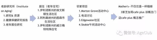 Mather LifeWays这家机构经过多年发展,旗下现在有四大服务板块:老龄研究所、老年住宅、邻里计划和Mather's-More Than a Café(Café plus)。其中最知名的Café plus模式将星巴克、Bally's和Elderhostel的完美融合,是美国老年人心中的一个创新典范。