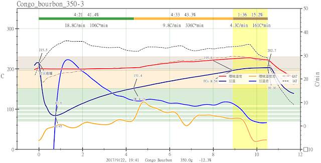 引用了那么多,总得自己实证一下。 之前,我已找到自己这部DIY002高热风比烘焙的最佳配置,当然是得力于有加进气温和排气温的量测。 这次,总共试了3锅,用的是不算软的刚果水洗波旁