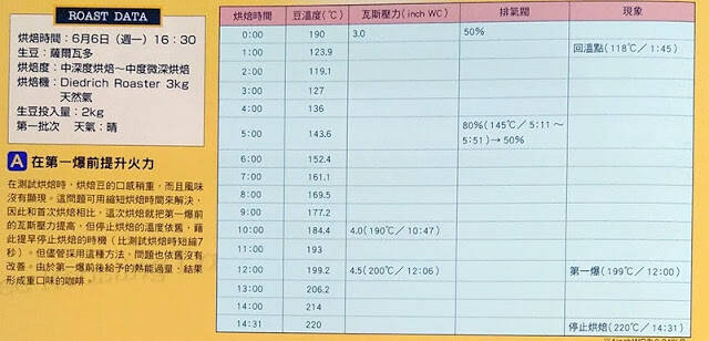 | Diedrich红外线半热风,在褐化后豆缩阶段加火,一爆开始后28秒再次催火直到下豆都不降火,烘焙者自评因入豆温提高了5度,整体烘焙时间缩短10秒,风味理想 |