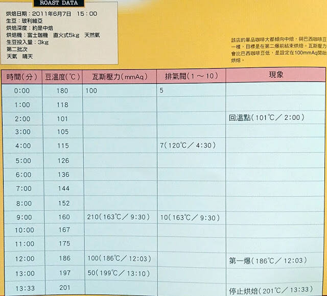 我们当然知道,烘焙曲线上的数字,只要换一部机器就会变得没什么意义,因此这些名店应当不用担心风味被重制,导致顾客流失的问题。 书内使用的烘焙机器,直火、半热风、热风均占有相当的比例,各个店家公开的炉次不一,总共有26个炉次,其中热风机占了7炉,其余19炉中,不论是直火或半热风,在入豆到一爆之间有加大火力的操作者占了4炉, 其余15炉采取的还是火力由大到小的方式操作。 这26炉,绝大部分都烘进二爆,加上书内的文字也没提到,因此无法推论中间增加火力的操作方式是为了催香,贴出3张烘焙纪录给大家参考