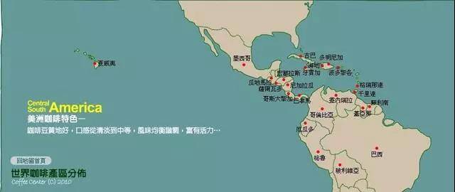- 咖啡豆的产地主要分为:非洲 、中南美洲、 亚洲及海岛 中南美洲豆风味:总的来说,风味比较中规中矩。其中的巴西咖啡醇厚浓郁,哥斯达黎加咖啡温和柔顺,酸香、甜香和巧克力香糅合在一起,极为平衡。巴拿马咖啡则是浓郁的柑橘香、茉莉花香、桃子和花蜜甜香,果酸明亮多变,与耶加雪菲极为神似。 ■ 味道的特征:均衡,酸味适中而香醇