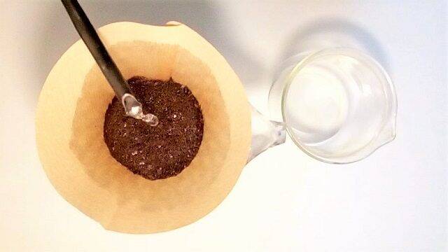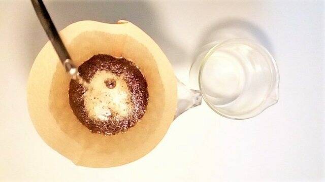 倒入热水时要注意的是不要倒在边缘(咖啡粉和过滤器之间的边界附近)。