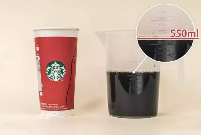 星巴克官网显示,他们的小杯是236ml、中杯是355ml、大杯是473ml,超大杯592ml。实测一杯超大杯美式,倒出来大概是550ml,少了42ml。