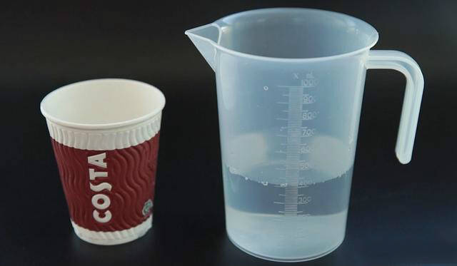 它家的杯子到底装多少咖啡呢? 分别把Costa的大杯、中杯、小杯装入满满的水,然后测量杯子的容积--