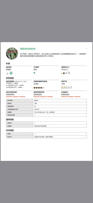 铁皮卡(Typica):埃塞俄比亚最古老的原生品种,所有阿拉比卡皆衍生自铁比卡。铁比卡顶叶为古铜色,豆体呈椭圆形或瘦尖形;风味优雅,但体质较弱,抗病力差,产果量少。牙买加蓝山、苏门答腊曼特宁、夏威夷可娜等优秀的庄园豆都属于铁比卡。铁比卡顶叶为古铜色是特征之一。 波旁(Bourbon):早期(咖啡史前)铁比卡移植到也门后的变种,豆形从瘦尖变成圆身。1715年,法国移植也门摩卡的圆身豆到非洲东岸的波旁岛(法国大革命后改称留尼汪岛Reunion)后才起名波旁。波旁圆身豆1727年辗转传到巴西和中南美洲、1732年英国移植也门摩卡到圣海伦娜岛(后来囚禁拿破仑的地方)也是波旁圆身豆。波旁是美洲精品咖啡杯测的常胜军。