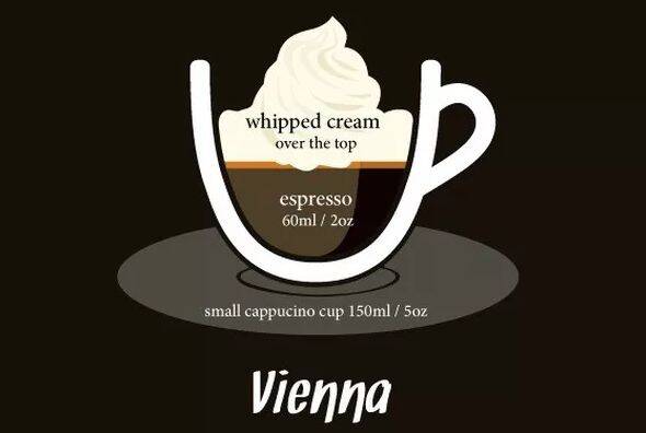 在奥地利旅游是,由当地极力推荐下亲身尝过Vienna,那是由2杯Espresso加入鲜奶油制成,也可以在最底层加入砂糖或冰糖,喝起来既香浓又爽口,非常适合恋爱中的情侣,但由於含有糖份与脂肪,所以要减肥要留意了!