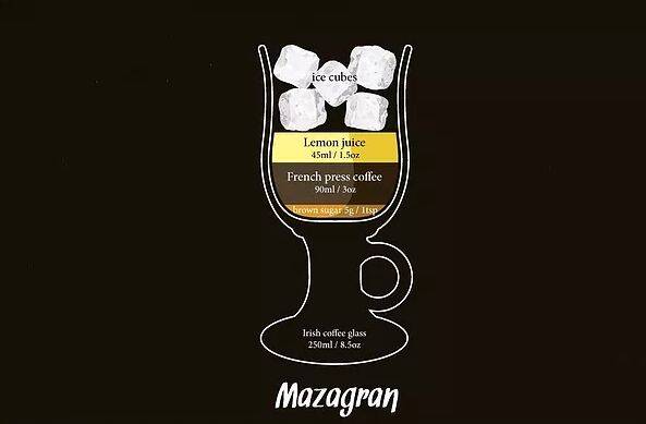 Mazagran , 由焦糖加入由法式滤压壶French Press冲泡出来的咖啡,再加入柠檬汁、冰块制成。也有人会加入白兰地、威士忌等酒品,据说当初这款咖啡还救过人命,真好奇是甚麽滋味?