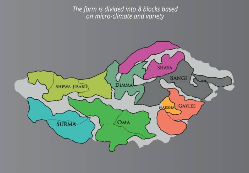 庄园西边地势相对较高,因此OMA、SURMA、SHEWA-JIBABU三个地块海拔稍高,而南边遮荫比例相对更高,北边阳光照射时间更长。八个地块中,庄园管理者根据海拔、土壤情况、遮荫条件等微气候差异,为每个地块选择一个最适宜的品种(如上图所示),确保各大地块都能形成鲜明的特色。