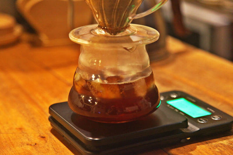 6、OK!整个萃取时间大约也是2分半钟左右(跟平时正常20克粉萃取时间接近)。等所有咖啡液流完,摇晃均匀。这时候冰块刚刚好溶解8成,剩下的冰块还能保持冰咖啡的冰度,而你,已经可以得到一杯足够冰爽舒心的冰手冲啦!