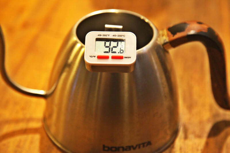 2、在温度与研磨的选择上,小编选择了比正常手冲建议的91℃,再高上1℃,正常研磨小富士3.5刻度,冰手冲则稍细半格-小富士3刻度。