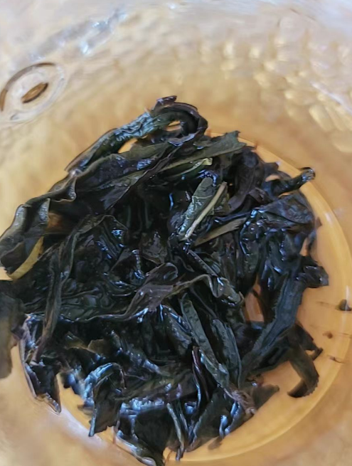 武夷水仙茶的茶叶条索肥壮,叶端扭曲,形似蜻蜓头。色泽乌绿润带宝色,叶背常现沙粒。干茶带有淡淡的兰花香,香气清幽而持久。