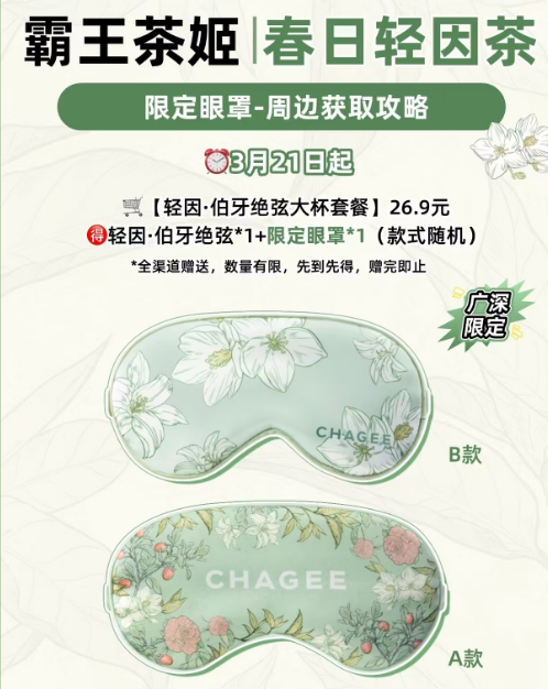 品牌官方表示,他们首次突破茶叶脱咖技术,也就是 “二氧化碳超临界萃取”,将茶叶中的咖啡因分离出来,降低其含量。为确保饮品的风味,又创新性加入白木香叶、酸枣仁、枸杞叶等原料。而之所以特别推出轻因系列,是因为他们在全网听到了很多茶友抱怨 “睡不着,真的睡不着”,有人 “凌晨三点替父从军,眼睛瞪得像铜铃”,也有人私信 “可不可以提供选择”...... 为了与新品背后的寓意相契合,“霸王茶姬” 戴上了眼罩,这个眼罩造型就成了大家误以为的新 Logo。
