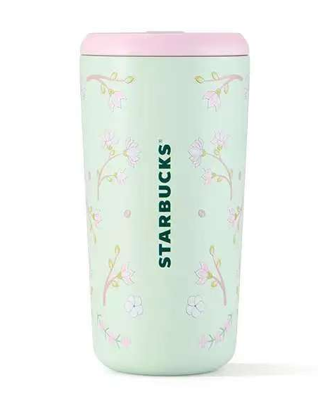 不锈钢桌面杯(475ml):原价239,粉绿色搭配,杯身描绘春花齐放的景象,磁吸旋盖的设计方便又好用。