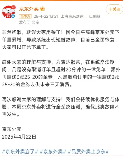 至于为何无人接单!京东官方也正式给出了回应。就在 4 月 22 日中午,“京东外卖崩了” 的话题直接冲上热搜。好多网友在社交媒体吐槽,下单后商家半天不接单,打电话给商家,商家表示后台根本没显示有订单。对此,客服回应称可能是系统短暂性出了点问题,已在加急处理,目前也陆续恢复了。其实这不是京东外卖首次出状况,4 月 16 日,就有多位用户反馈京东外卖页面无法查看商品信息,当时 “京东外卖崩了” 的话题也迅速登上微博热搜。后来京东表示,是因为百亿补贴活动太火爆,流量达到平时 4 倍,系统出现了不到 20 分钟的短暂异常。为表歉意,额外发放了 10 万张 “满 15 减 10” 优惠券给用户。这次的故障,京东外卖官方也在下午 13:21 发文致歉,承诺对所有超时 20 分钟以上的已完成外卖订单免单,额外再赠送3张25-20的金券:凡是取消订单的一律赠送2张25-20的金券以供未来三天消费。虽然这次“无人接单”的事情遭到众多网友吐槽,但是京东的应对也是诚意满满,得到了不少消费者的认可。