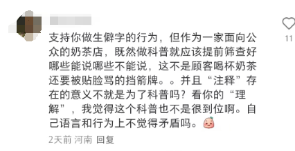 对于商家打着科普生僻字的旗号却造成不良影响的做法,网友也毫不留情地指出:“支持你做生僻字的行为,但作为一家面向公众的奶茶店,既然做科普就应该提前筛查好哪些能说哪些不能说,这不是顾客喝杯奶茶还要被贴脸骂的挡箭牌。并且‘注释’存在的意义不就是为了科普吗?看你的‘理解’,我觉得这个科普也不是很到位啊。自己语言和行为上不觉得矛盾吗。普及生僻字的前提,主理人是不是应该知道这字具体意义呀。说文解字网、字统网等等免费的查字网站很容易找到,如果以此为卖点,还是多上点心吧。想科普不能放在杯壁上吗,喝个奶茶还要被脏字贴脸。”