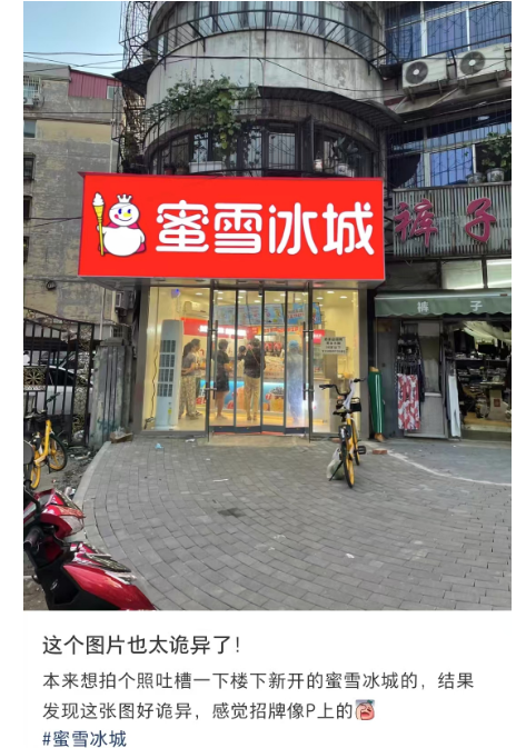 还有网友本来想拍个照吐槽一下楼下新开的蜜雪冰城的门头,结果拍完后却发现照片里的招牌看起来十分诡异。从照片上看,原本红底白字、十分醒目的蜜雪冰城招牌,像是被 P 上去的一样,与周围的环境格格不入。招牌的颜色似乎有些失真,边缘也显得很不自然,再加上周围的光线和角度问题,给人一种虚幻、不真实的感觉。网友们看到这张照片后,纷纷在评论区留言,有人说:“真的好像 P 上去的,难道是蜜雪冰城在搞什么神秘营销?” 也有人调侃:“这门头是穿越过来的吧,怎么这么违和。” 这种诡异的视觉效果,虽然让人摸不着头脑,但也成功引发了网友们的好奇心和讨论热情,使得这家门店在网络上迅速传播开来。