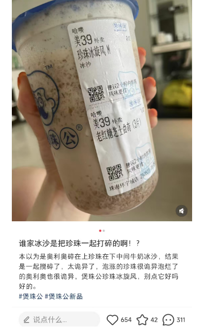 在茶饮新品层出不穷的当下,煲珠公推出的珍珠冰旋风一经上市,便在社交平台引发了一场激烈的 “口感之争”。消费者对这款融合珍珠、奥利奥与牛奶冰沙的新品评价两极分化,有人将其奉为 “梦中情饮”,也有人直呼 “踩雷天花板”,争议声浪中,煲珠公珍珠冰旋风成功吸引了众多目光。